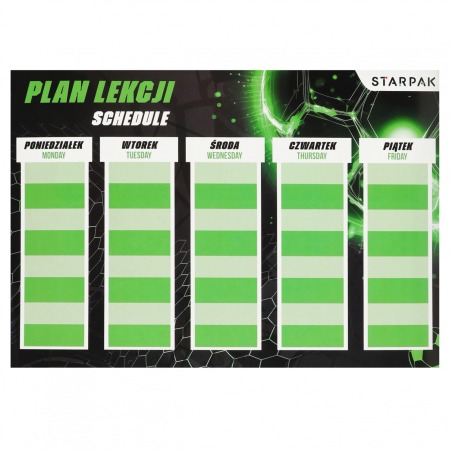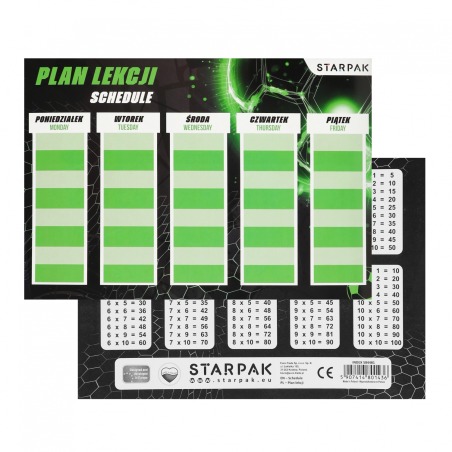⭐ Plan z kolekcji STARPAK z serii Football zawiera podział na pięć dni tygodnia z 8 wierszami do wpisu, dzięki czemu żaden uczeń nie zapomni o potrzebnych mu danego dnia książkach czy zeszytach, dodatkowo na odwrotnej stronie posiada tabliczkę mnożenia.