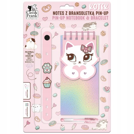 ❤️ W zestawie znajduje się gumowa bransoletka, notatnik, długopis oraz trzy ozdobne piny w kształcie łapki, kokardki oraz babeczki.