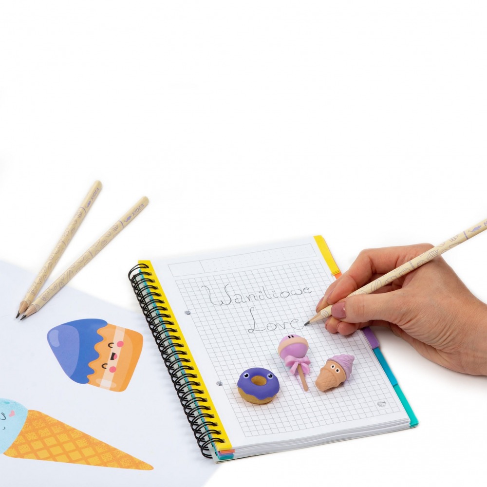 • Zapachowy niezbędnik Kidea o słodkim, waniliowym aromacie zawiera 3 ołówki o twardości rysika HB oraz trzy smakowite gumki w kształcie babeczki, donuta i lizaka.