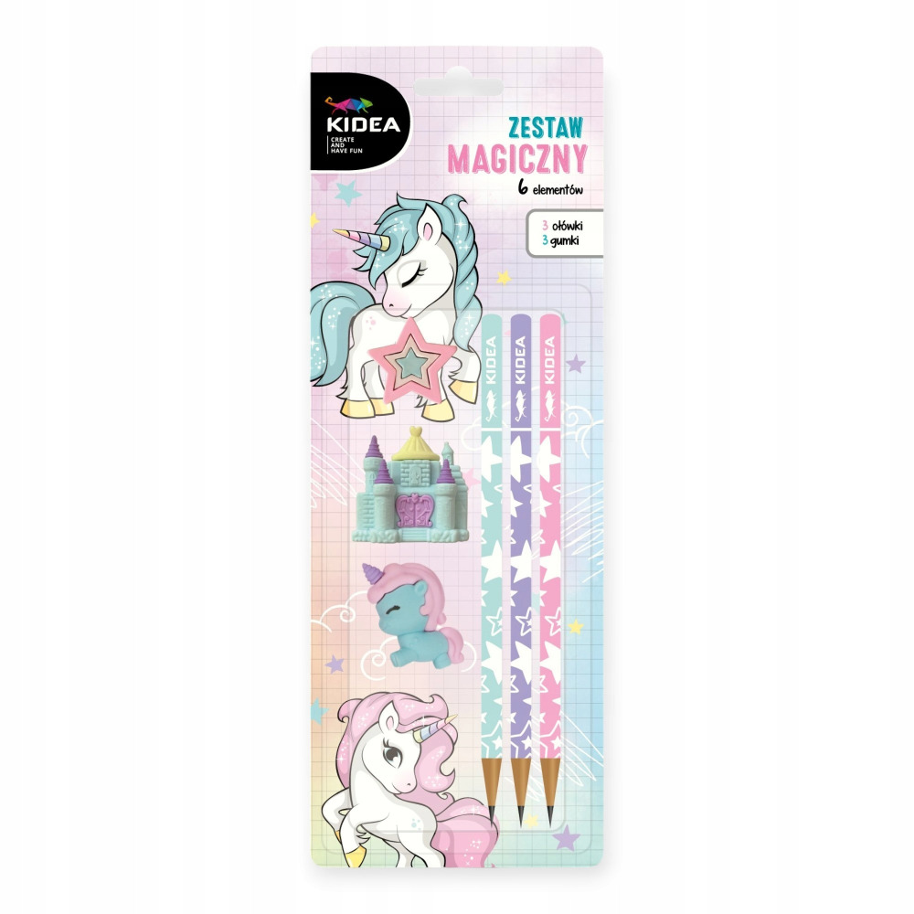 Wzbogać swój piórnik o uroczy zestaw z motywami Magic! 3 ołówki i 3 gumki - w kształcie jednorożca, zamku i gwiazdki sprawią, że nauka stanie się przyjemnością.
