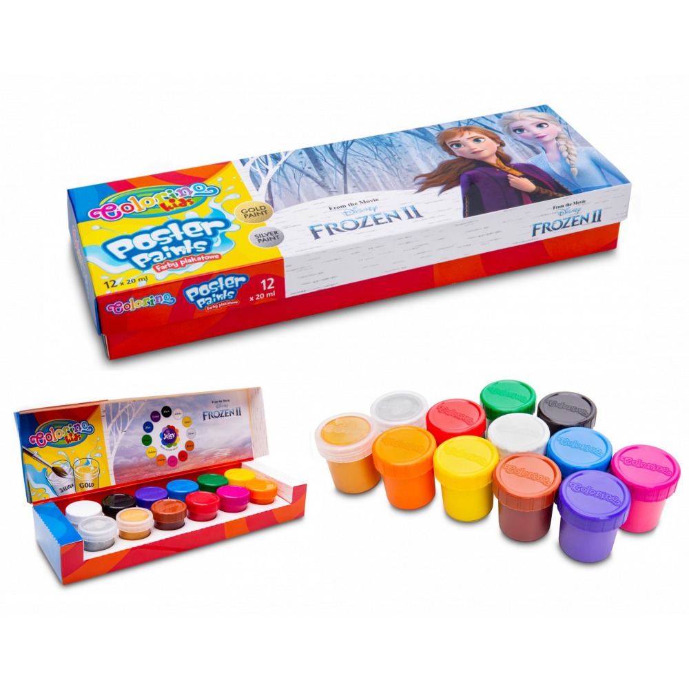 Farby plakatowe Colorino Frozen II to 12 soczystych kolorów, a pośród nich także wyjątkowy srebrny oraz złoty.