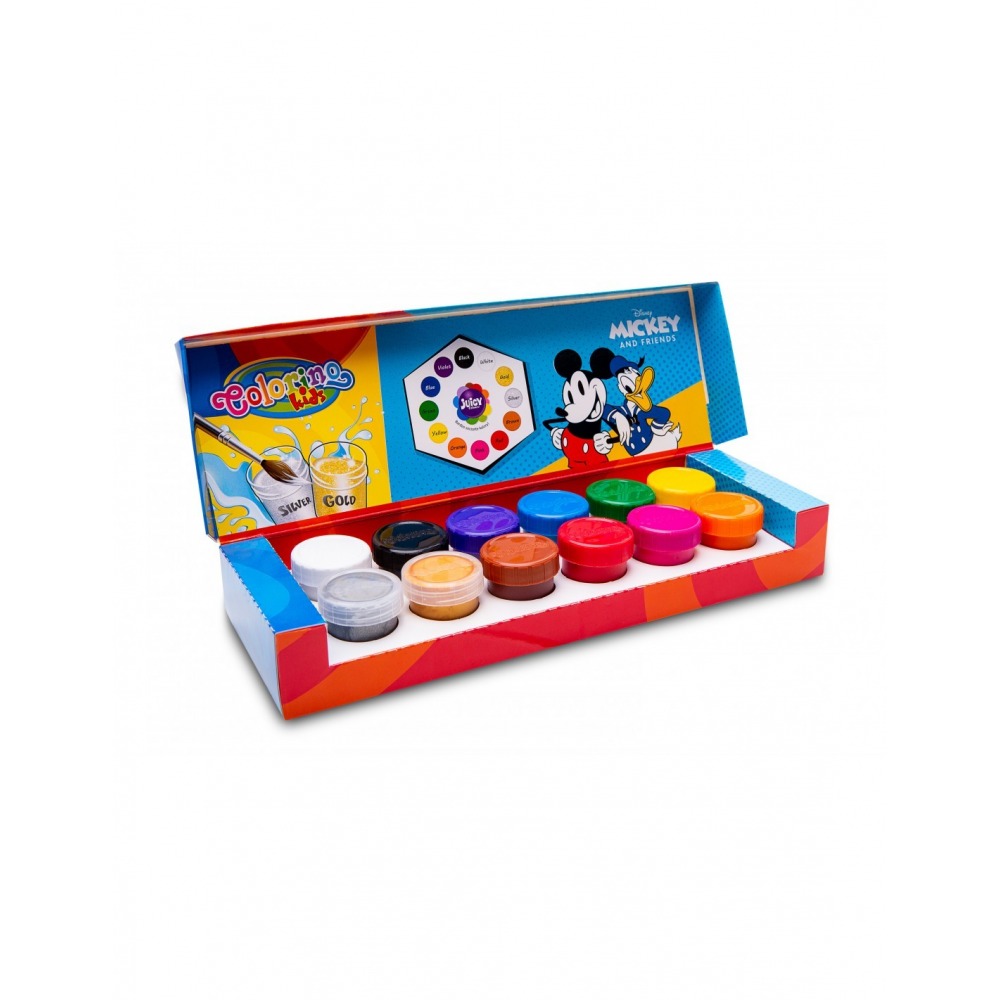 Farby plakatowe Colorino Myszka Mickey i przyjaciele to 12 soczystych kolorów, a pośród nich także wyjątkowy srebrny oraz złoty.