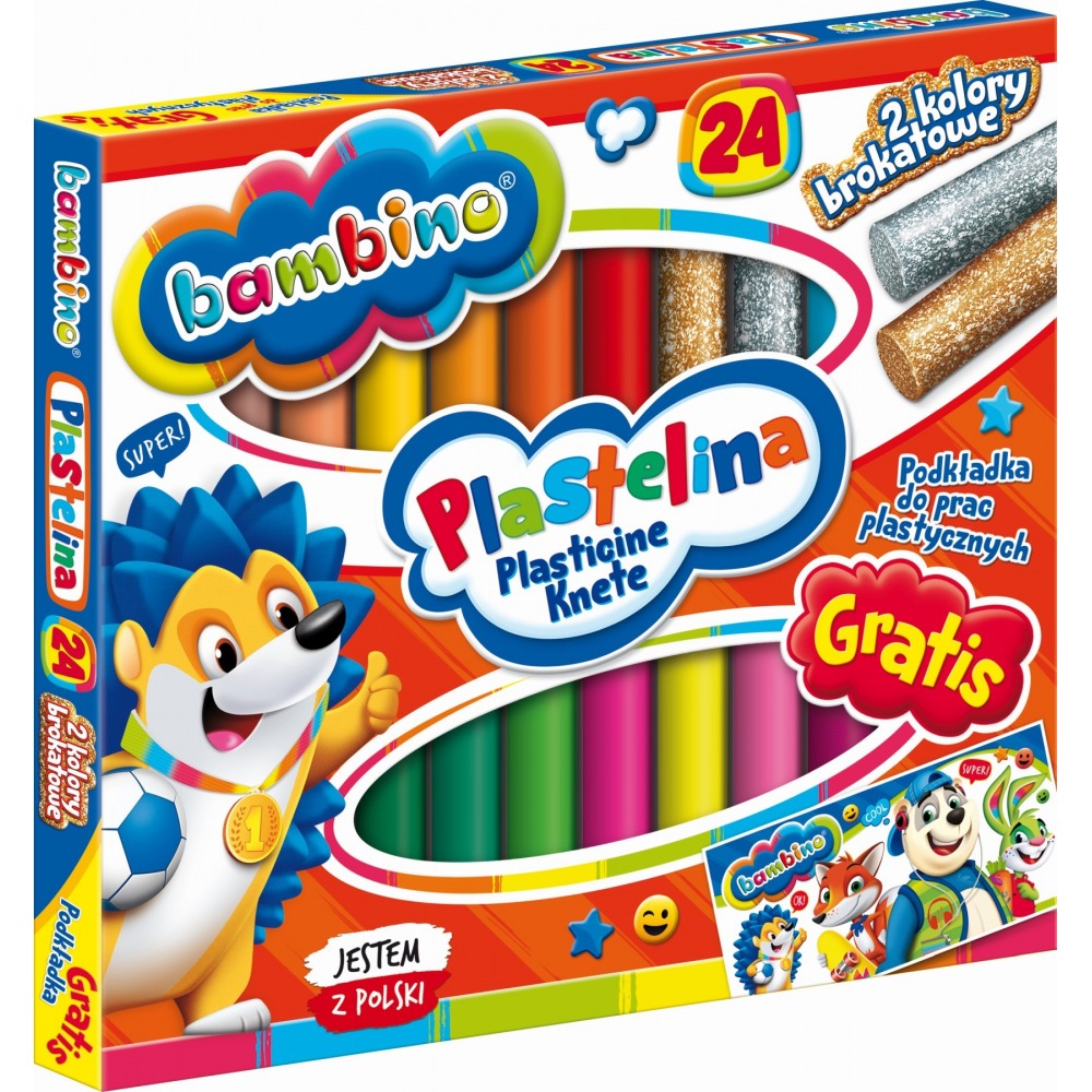 Plastelina Bambino to wysokiej jakości masa plastyczna. Jest elastyczna, nie brudzi rąk, nie przywiera do podłoża, łatwo się modeluje, pozwala na tworzenie prac metodą millefiori. Nie wysycha na powietrzu, przez co może być wykorzystywana wielokrotnie. Gama kolorów jest szeroka, barwy żywe, nasycone.