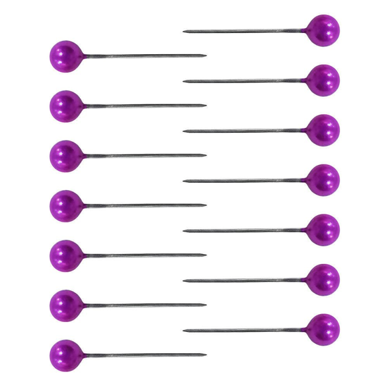Szpilki dekoracyjne z perłowymi błyszczącymi główkami w kolorze fioletowym.