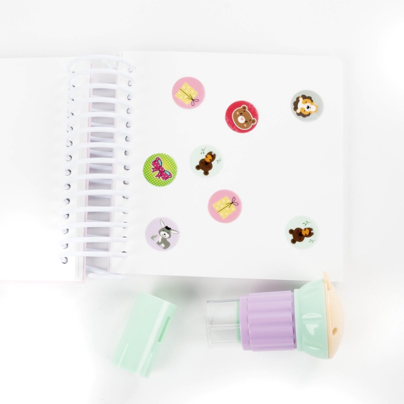 Naklejkowy stempel. Można go wykorzystać na wiele sposobów: jako znacznik na tablicach motywacyjnych, do zdobienia prac plastycznych, prezentów albo listów, czy znacznika ważnych miejsc w książkach i kalendarzach. Naklejki umieszczone są wewnątrz stempelka dzięki wbudowanemu schowku z wkładem. Wystarczy przycisnąć produkt do powierzchni aby móc od razu stemplować naklejki. Do zestawu dołączone są dwa wkłady na wymianę.