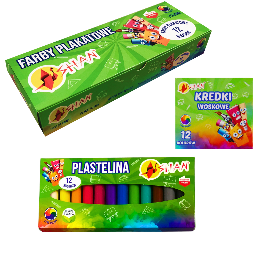 Oferujemy zestaw artystyczny zawierający farby plakatowe, plastelinę oraz kredki woskowe marki Shan. Nasz zestaw to idealna propozycja dla młodych artystów, którzy pragną rozwijać swoją kreatywność i umiejętności plastyczne.