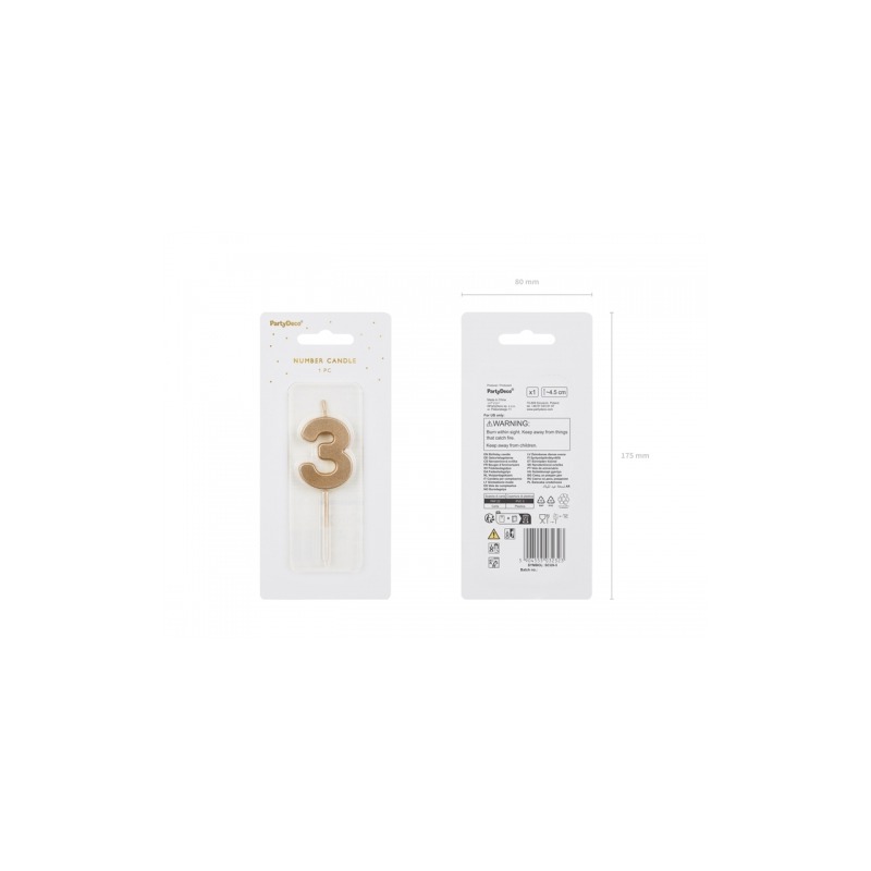✅✅ Złota świeczka urodzinowa w kształcie cyferki "3" to elegancki dodatek do każdego tortu urodzinowego. Dzięki uniwersalnemu designowi idealnie sprawdzi się także na jubileusze oraz inne wyjątkowe okazje. Świeczka ma ok. 4,5 cm wysokości, co czyni ją doskonałą dekoracją – subtelną, ale widoczną. Błyszczące, złote wykończenie nadaje tortowi wyjątkowego charakteru i odświętnego wyglądu. ✅✅