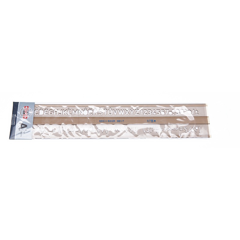 Szablon literowo-cyfrowy pisma pionowego. Umożliwia pisanie liter małych, dużych, cyfr, znaków interpunkcyjnych i specjalnych oraz symboli matematycznych. Wykonany jest z dymionego tworzywa sztucznego. Przystosowany do kreślenia tuszem.