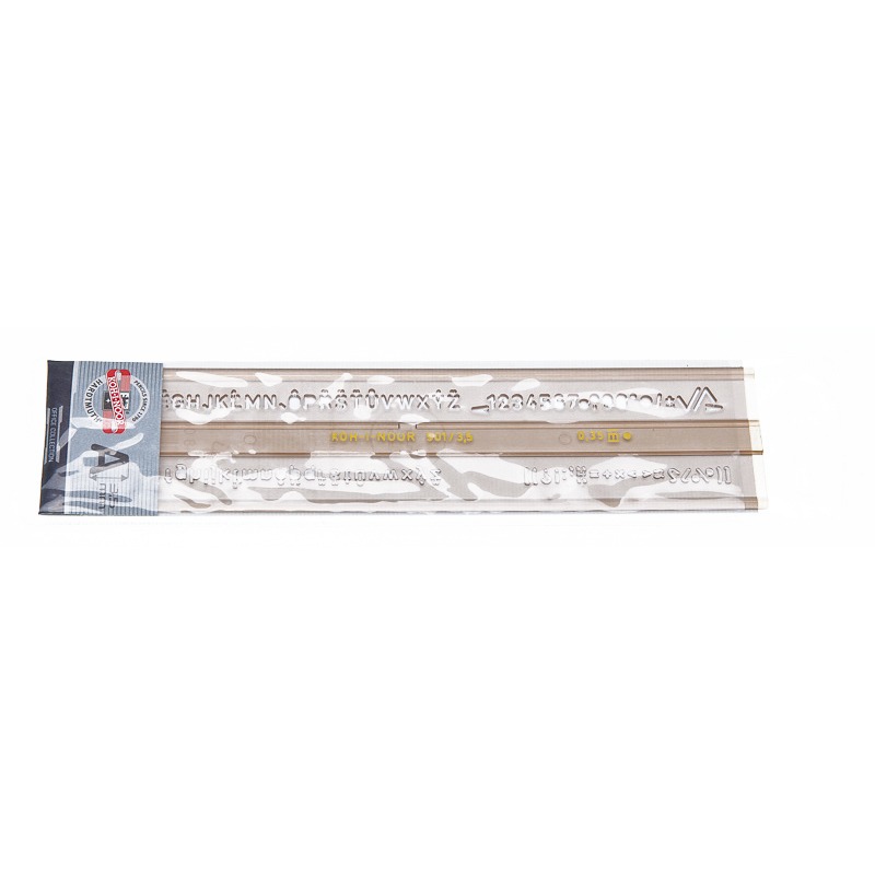 Szablon literowo-cyfrowy pisma pionowego. Umożliwia pisanie liter małych, dużych, cyfr, znaków interpunkcyjnych i specjalnych oraz symboli matematycznych. Wykonany jest z dymionego tworzywa sztucznego. Przystosowany do kreślenia tuszem.