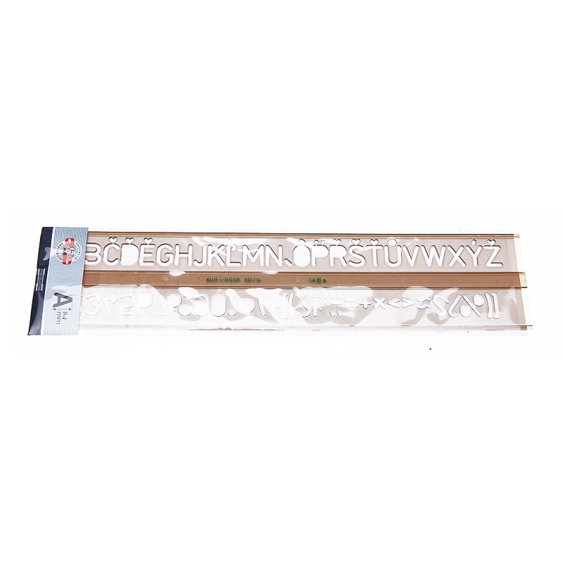 Szablon literowo-cyfrowy pisma pionowego. Umożliwia pisanie liter małych, dużych, cyfr, znaków interpunkcyjnych i specjalnych oraz symboli matematycznych. Wykonany jest z dymionego tworzywa sztucznego. Przystosowany do kreślenia tuszem.