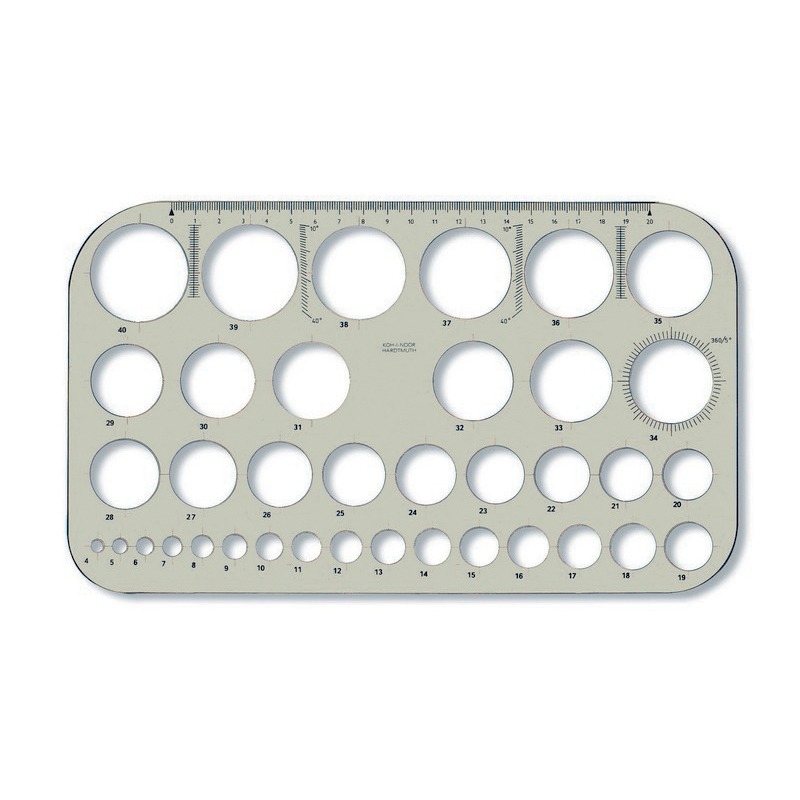 Szablon wykonany jest z dymionego tworzywa sztucznego. Umożliwia rysowanie kół o średnicy od 4 do 40 mm