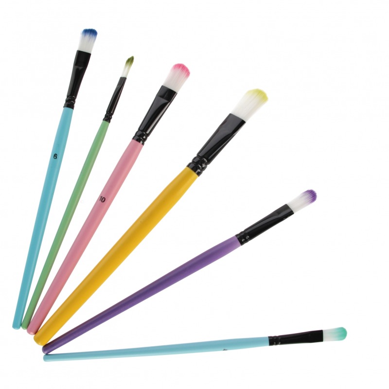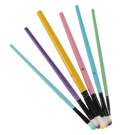 ⭐ Zestaw 6 pędzli o różnych grubościach i kształtach, raczki w modnych pastelowych kolorach, lekka i wygodna konstrukcja, dopasowana do dziecięcych raczek, miękkie, syntetyczne włosie, idealne do farb plakatowych, wodnych i akwareli.