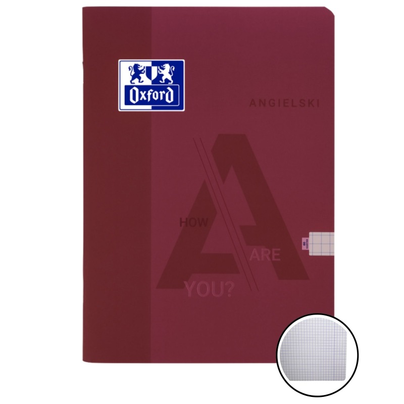 Cechy główne Kartonowa okładka, pokryta aksmaitną folią soft touch jest niezwykle przyjemna w dotyku Na okładce monokolorowa grafika z literą A, oznaczająca język angielski Miękkie, lekkie okładki są wytrzymałe i nie obciążają plecaka Zszywany grzbiet zeszytu umożliwia jego wygodne otwarcie na płasko Papier Optik Paper jest śnieżnobiały i idealnie gładki, co ułatwia pisanie i czytanie notatek Cechy dodatkowe Format A5 60 kartek w kratkę z marginesem Stonowany, bordowy kolor