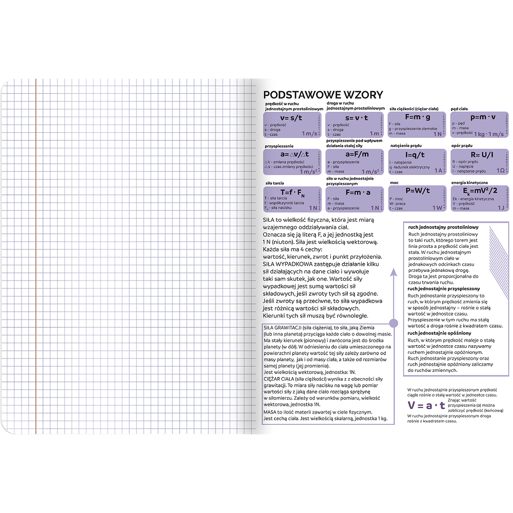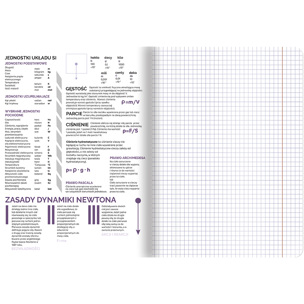 Cechy główne Ściągi na wewnętrznych stronach okładek pomagają w nauce i przyswajaniu materiału Folia anti-scratch na okładkach zapobiega ich rysowaniu się w plecaku Miękkie, kartonowe okładki są lekkie i nie obciążają plecaka Grzbiet zszywany zszywkami łatwo się otwiera i umożliwia wygodne notowanie Wybiórczy lakier na okładkach dodaje im charakteru Cechy dodatkowe Format A5 60 kartek w kratkę z marginesem Czarny kolor okładki z piktogramem nawiązującym do fizyki