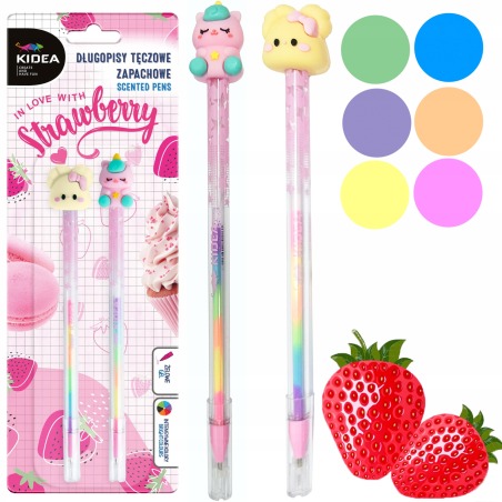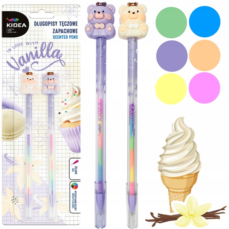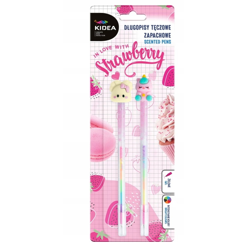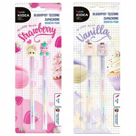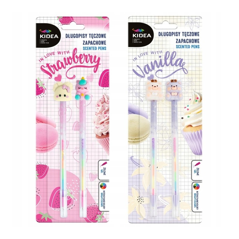 ❤️ Zapachowe długopisy żelowe KIDEA to doskonały wybór dla dzieci, które kochają pisać kolorowo i kreatywnie. Zestaw zawiera 2 długopisy z figurkami, które pachną słodką wanilią lub truskawką i piszą w 6 kolorach zmieniających się podczas pisania. ❤️