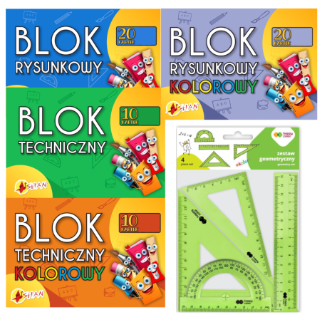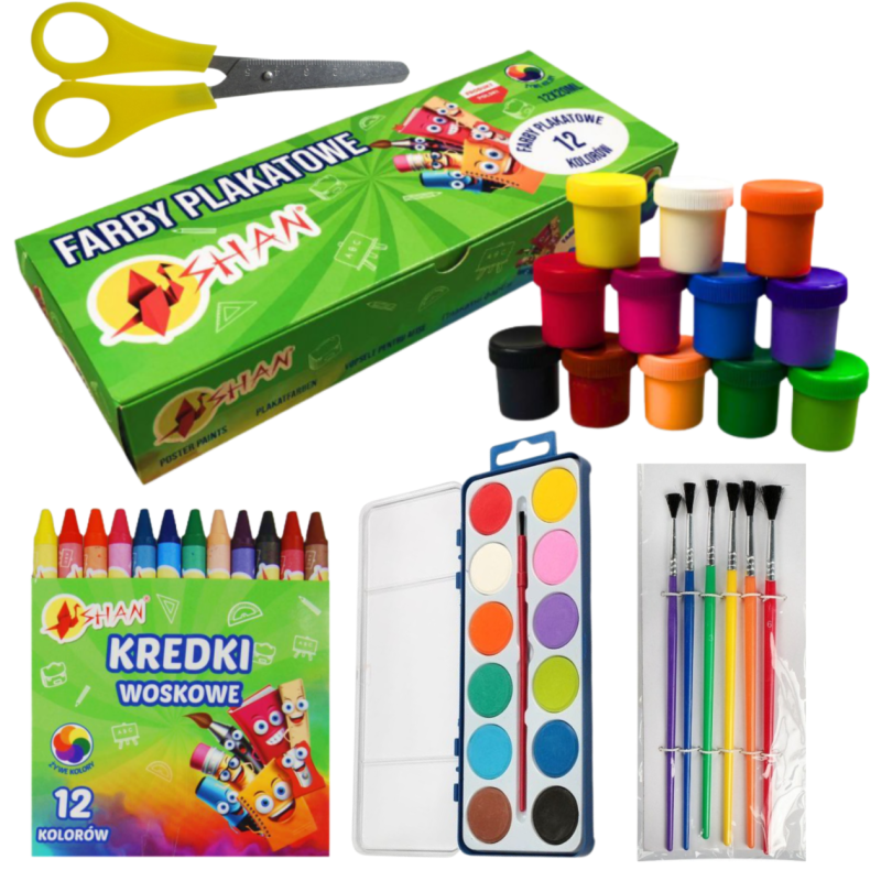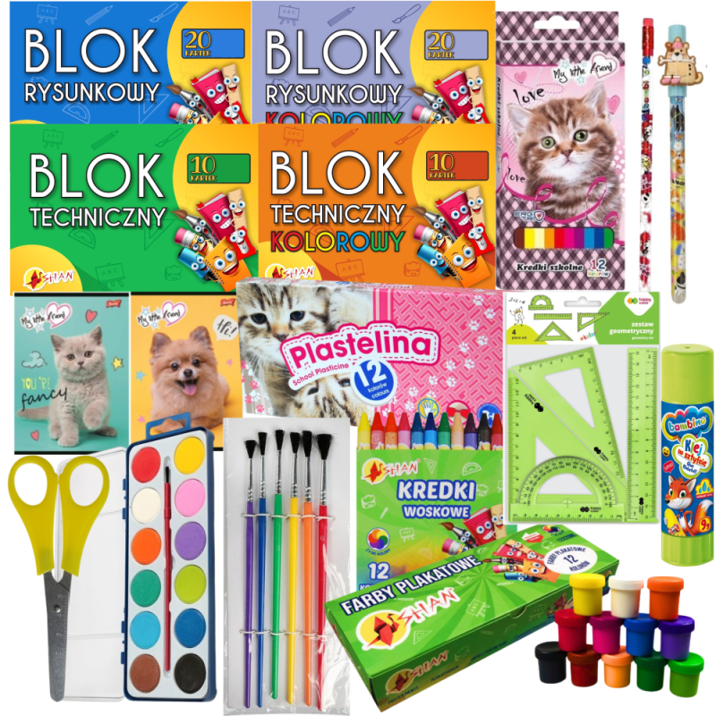 ✅ Kredki ołówkowe 12 kolorów My little friend BAMBINO 0263 ✅ Plastelina 12 kolorów Astra Kotki ✅ Długopis wymazywalny Zwierzaki Titanum ✅ Zeszyt A5 32k kratka laminowany My Little Friend psy/koty mix Unipap ✅ Zeszyt A5 32k linia podwójna dwukolorowa My Little Friend Unipap Majewski ✅ Farby plakatowe 12 kolorów 20 ml Shan ✅ Kredki woskowe 12 kolorów Shan ✅ Klej w sztyfcie 9g Bambino ✅ Farby akwarelowe 12 kolorów Titanum ✅ Pędzelki szkolne 6 szt Titanum ✅ Nożyczki z podziałką Shan ✅ Ołówek z gumką Bambino ✅ Zestaw geometryczny 4el Happy Color ✅ Blok rysunkowy biały 100g ✅ Blok rysunkowy kolorowy ✅ Blok techniczny biały ✅ Blok techniczny kolorowy