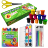 Zawiera 12 guziczków z farbami o średnicy 28 mm, umieszczonych w plastikowym opakowaniu oraz pędzelek. Wieko opakowania może stanowić paletę do mieszania farb. Wystarczy zmieszać je z wodą, aby uzyskać różne odcienie kolorów od gęstych, wyrazistych aż po delikatne, półprzezroczyste. W połączeniu z białą farbą, można tworzyć zupełnie nowe odcienie. Akwarele można również wykorzystywać w połączeniu z innymi technikami (z farbami temperowymi, plakatowymi i kredkami woskowymi).Farby te posłużą głównie dzieciom i młodzieży szkolnej rozpoczynającej edukację plastyczną. Dzięki niewielkiemu rozmiarowi i poręczności opakowania mogą być łatwo przenoszone np. w uczniowskich tornistrach oraz przechowywane przez długi czas bez obawy zmiany właściwości. W zestawie 12 kolorów farb. Średnica guziczka z farbą: 28 mm.