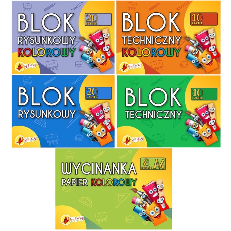 W zestawie znajdują się bloki białe i kolorowe oraz blok nabłyszczany marki Shan które uważamy że jakościowo są jeszcze lepsze niż marki Bambino.