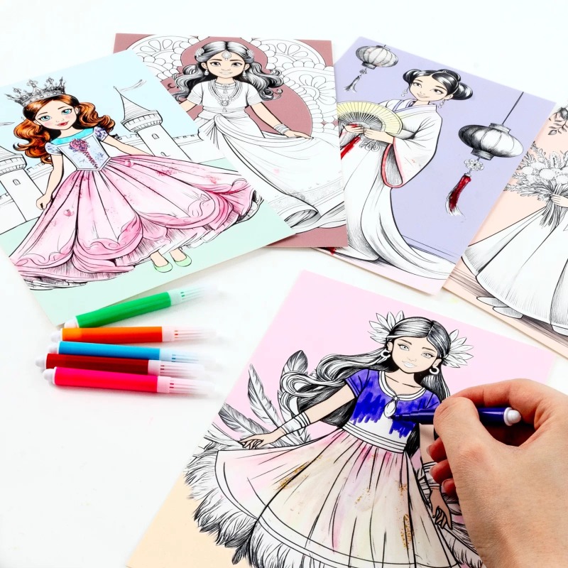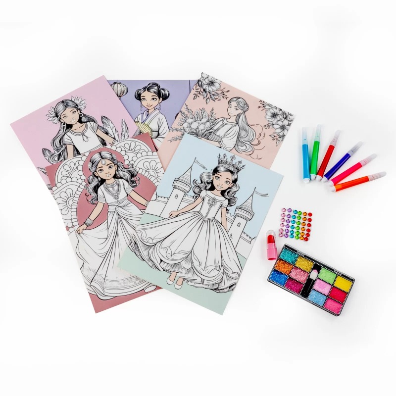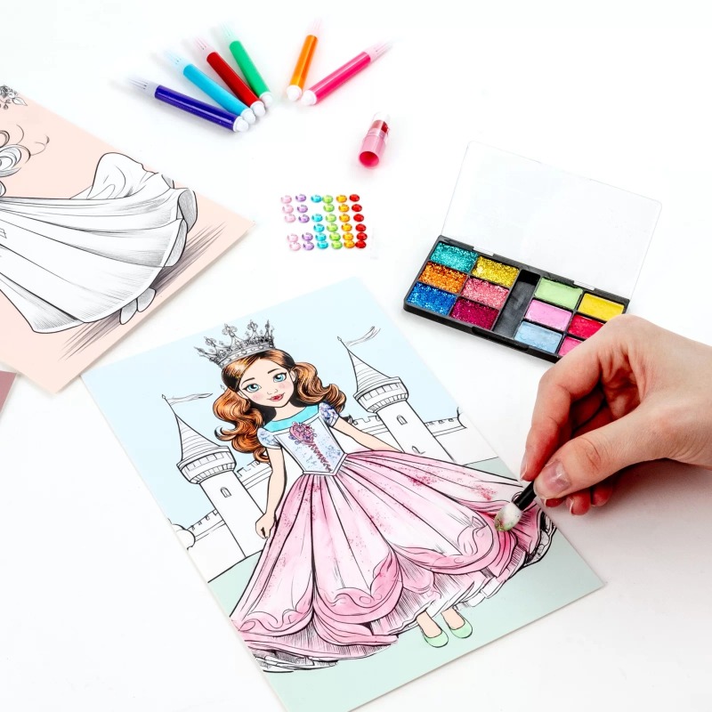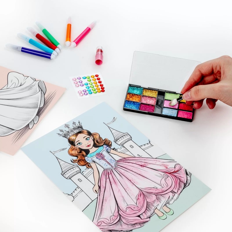 ✅ Zestaw obejmuje 5 plansz z motywami księżniczek w oryginalnych strojach i sukniach, 1 szminkę, 6 mini markerów, 36 diamentów oraz 12 cieni.