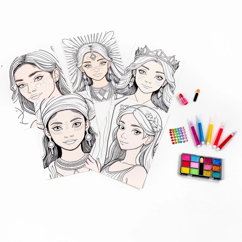 ✅ Zestaw obejmuje 5 różnorodnych plansz z motywami księżniczek do malowania, 1 szminkę, 6 mini markerów, 36 diamentów oraz 12 cieni.