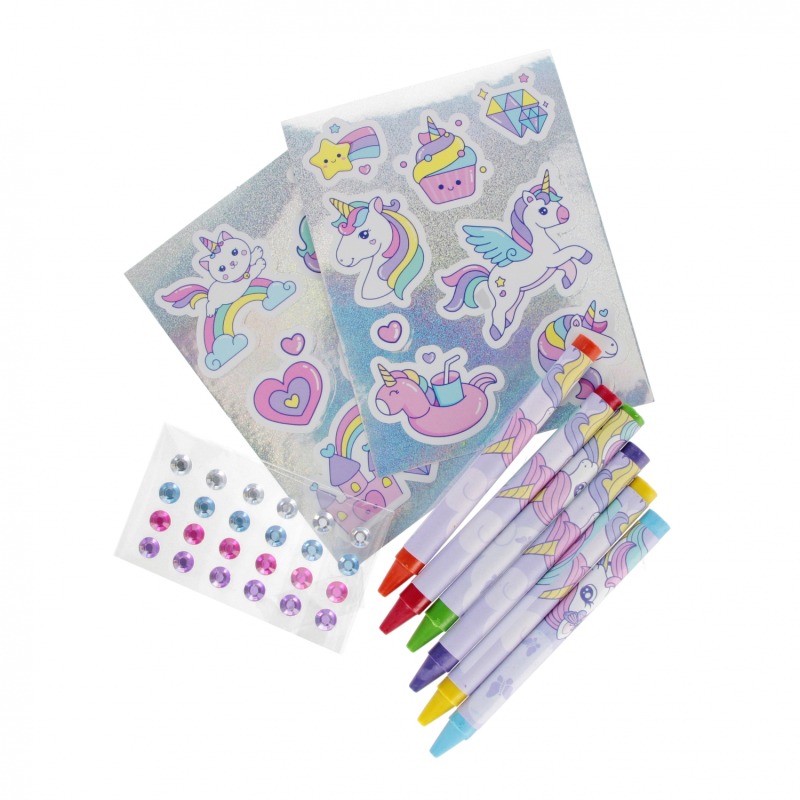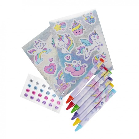 ⭐ Zestaw zawiera: 1x kolorowanka, 6x kredki woskowe mix kolor, srebrne naklejki,24 x diamenciki mix kolorów.