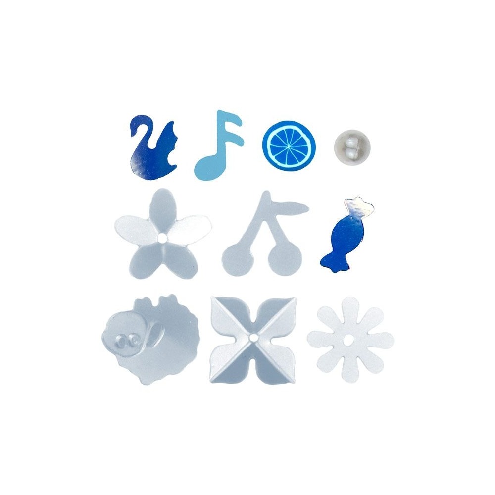 • W skład zestawu wchodzą: perełki 4 mm, cekiny kwiatek płaski 10 mm, kwiatki wypukłe 2 wzory 10 mm, konfetti truskawka 5 x 7 mm, czereśnie 10 x 9 mm, nuta 6 x 9 mm, łabędź 6 x 8 mm, cukierek 8 x 3 mm, owca 12 x 11 mm, avocado dwustronne 5 x 6, 6 x 8 mm 14 g tonacja biała.